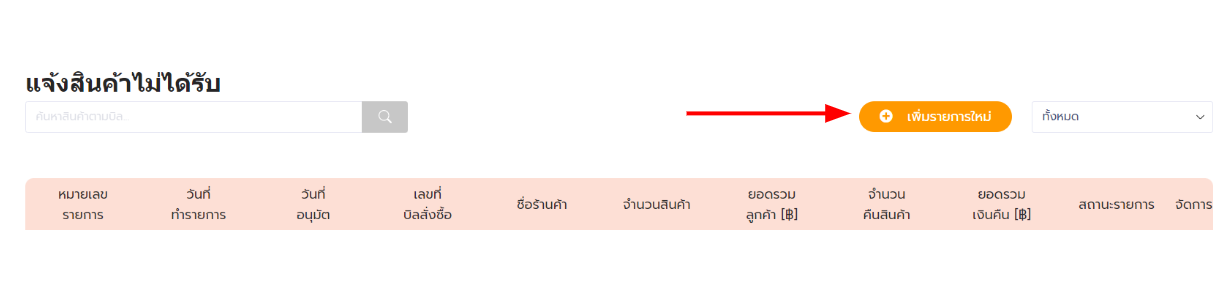- เมื่อลูกค้าได้รับสินค้าไม่ครบ เข้าเมนูแจ้งสินค้าไม่ได้ จากนั้นกดเพิ่มรายการใหม่