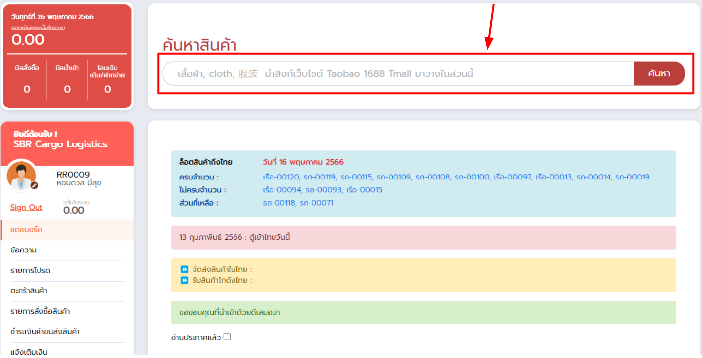 - เข้าสู่ระบบตามปกติ เมื่อเข้าสู่ระบบสำเร็จแล้ว กดเลือกเมนูเช็คสถานะและแจ้งส่งของ ลูกค้าสามารถเช็คสถานะสินค้าที่เข้าโกดังจีน ออกจากโกดังจีน และสินค้าที่สถานะถึงไทยได้จากหัวข้อนี้