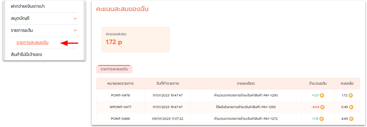 - เข้าเมนูรายการแต้ม > รายการสะสมเเต้ม จากนั้นระบบจะแสดงรายการแต้มที่ลูกค้าได้สะสมไว้ ซึ่งรายการแต้มเหล่านี้ จะได้มาจากค่าขนส่งจากจีนสะสมไว้เป็นแต้มทุกครั้งที่มีการชำระเงินของลูกค้า