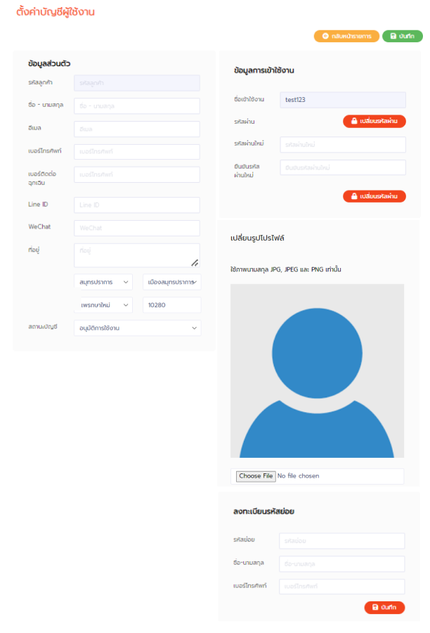 - ลูกค้าสามารถแก้ไขข้อมูลการติดต่อ รหัสผ่านสำหรับใช้เข้าสู่ระบบเเละรูปโปรไฟล์ได้ เมื่อแก้ไขข้อมูลเรียบร้อยแล้ว กดปุ่ม “บันทึก” (ไม่สามารถแก้ไขรหัสลูกค้า และชื่อผู้ใช้งานได้) ลูกค้า