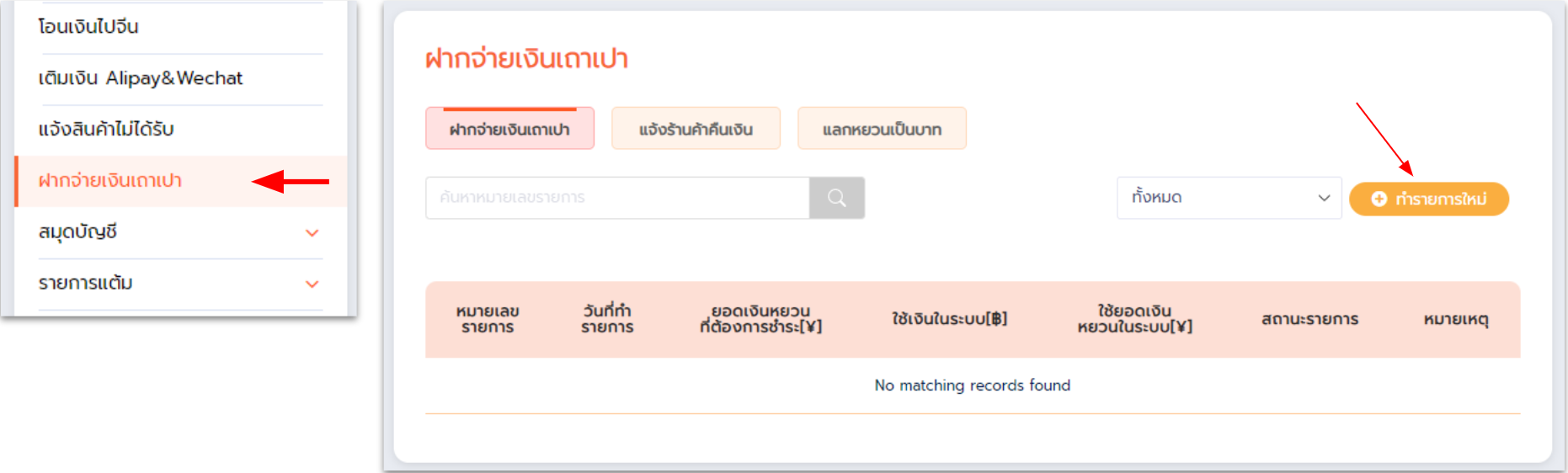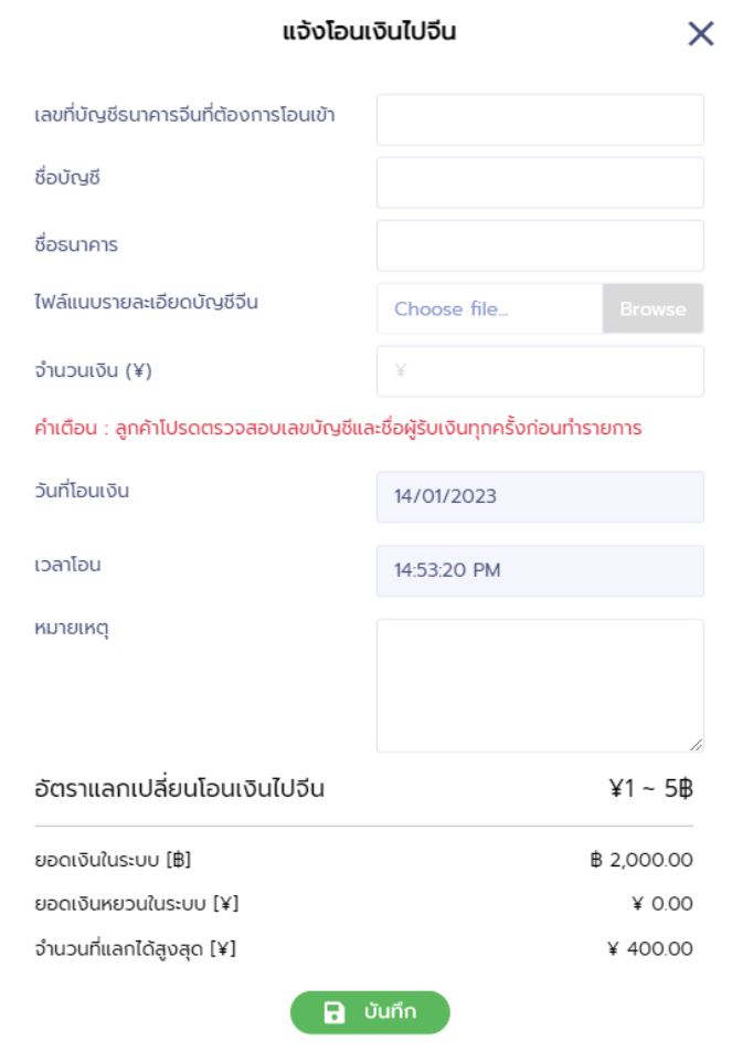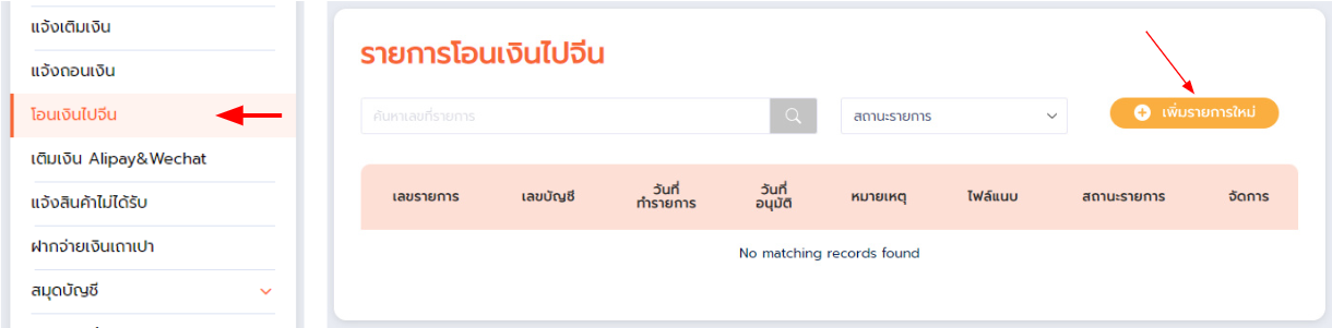 *ลูกค้าต้องมีเงินในระบบพอที่จะทำรายการได้ หากมีเงินในระบบไม่พอ ลูกค้าต้องเติมเงินเข้าระบบก่อนทำรายการ จากนั้นรอการตรวจสอบและดำเนินการจากบริษัท เมื่อบริษัทโอนเงินเรียบร้อยแล้วจะบันทึกหลักฐานการโอนเงินไปธนาคารจีนไว้ในระบบ ซึ่งลูกค้าสามารถตรวจสอบสถานะการดำเนินการได้ในส่วนนี้