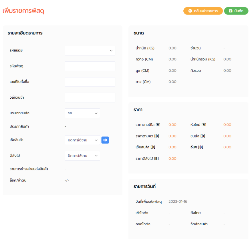 - รหัสพัสดุ : ใส่ตัวเลขหรือตัวอักษรติดกัน ไม่ต้องเว้นช่องว่าง