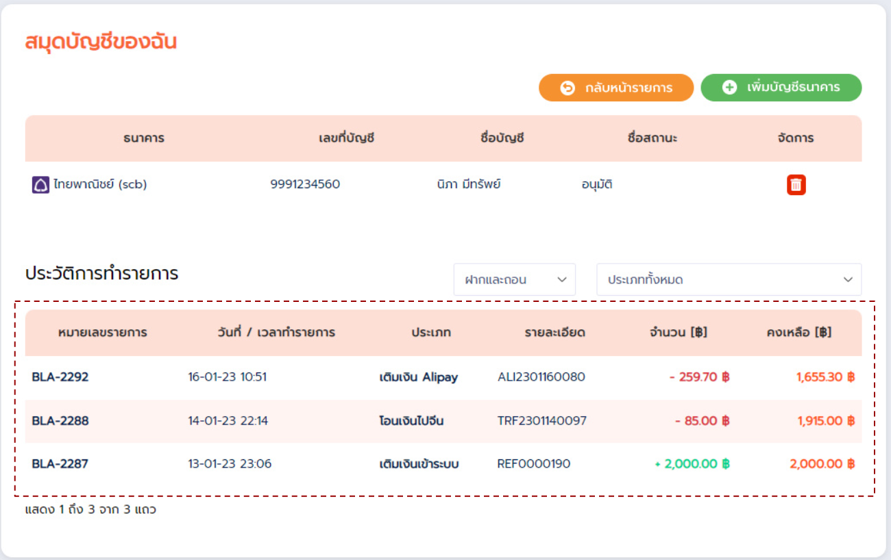 - ระบบจะะเเสดงประวัติการทำรายการ จรายการเงินเข้า-ออกในระบบ และยอดเงินคงเหลือ